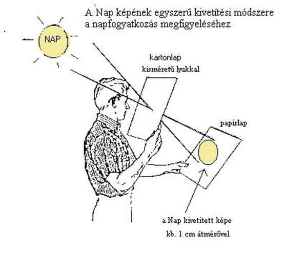 Ha nem sikerült speciális védőszemüveget találnunk, kipróbálhatjuk az Országos „Frédéric Joliot-Curie” Sugárbiológiai és Sugáregészségügyi Kutató Intézet módszerét is, amihez csak két papírlapra és egy tűre van szükség. A camera obscura elvén alapuló kivetítéshez egy kartonlapba kisméretű lyukat készítünk (például gombostűvel átlyukasztjuk) és a Nap képét ezzel vetítjük ki egy felületre, például egy fehér papírlapra.
